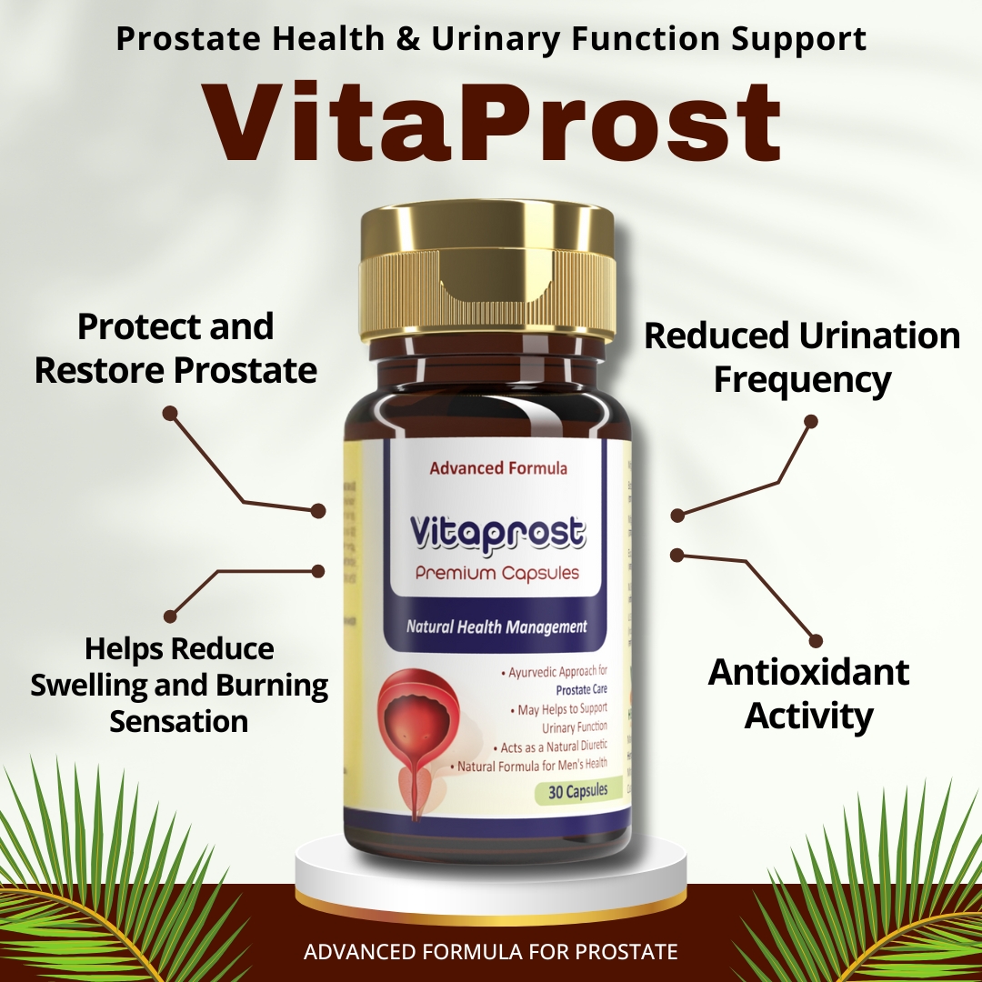 Experience the Ayurvedic effect with Vitaprost Premium Capsules, which is a scientific formula for the natural care and management of a prostate and urinary health. Formulated with men’s health in mind, Vitaprost restores vitality, supports the enlarged prostate, and improves urination. Potent Ayurvedic ingredients balance urination patterns, relieve discomfort, and encourage healthy inflammatory responses; thus, it’s a comprehensive approach to long-term prostate care.It becomes essential to take care of prostate health as men age, and Vitaprost is the answer with its advanced formula. The supplement nourishes prostate cells, improves urine flow, and supports hormonal balance in order to take care of all the dimensions of prostate wellness. Be it the alleviation of urinary discomfort symptoms or proactive care of your prostate, the ultimate Ayurvedic supplement is here to enhance your overall health and well-being naturally with Vitaprost.Why choose Vitaprost?Protect and Restore Prostate Health: Helps to have a healthy prostate and to decrease swelling or inflammation.Reduced Urination Frequency: Supports improved bladder control and minimizes frequent urges, especially at night.Relieves Discomfort: Relieves burning sensations and discomfort during urination.Antioxidant Power: fights off oxidative stress in your prostate.Who Should Use Vitaprost?If you’re experiencing:Difficulty or discomfort during urination.Frequent urination, especially at night.Burning sensations or urinary infections.Prostate health concerns.Dripping urineIngredients in Vitaprost CapsulesPashanbhed: Known for its diuretic and anti-inflammatory properties, this herb supports healthy urinary function and helps manage urinary infections effectively.Shuddha Mukul: Promotes hormonal balance and supports prostate health by reducing inflammation and improving overall vitality.Gokshur Extract: A powerful Ayurvedic ingredient that aids in improving urine flow, supports kidney function, and helps maintain prostate health.Varun Extract: Renowned for its role in promoting urinary tract health, it helps reduce swelling and discomfort associated with an enlarged prostate.Kanchanaar Extract: Helps detoxify the body, supports healthy glandular function, and assists in maintaining prostate wellness.Ashwagandha Extract: Known for its adaptogenic properties, it helps reduce stress, supports hormonal balance, and enhances overall male health and vitality.Take charge of your prostate health today. Choose Vitaprost Premium Capsules for a healthier, happier you with your growing age.✔ 30 Capsules per Bottle✔ Free Shipping✔ 100% Satisfaction Guaranteed